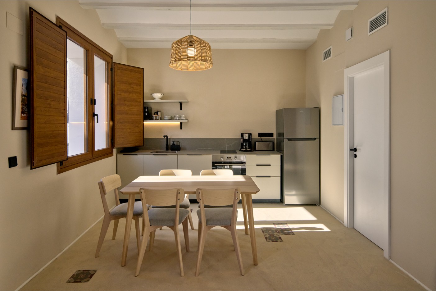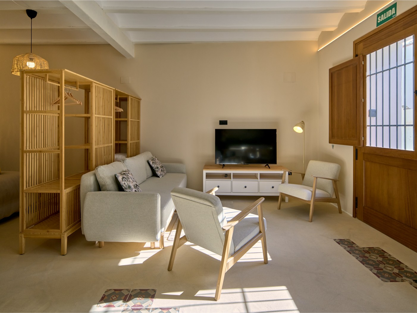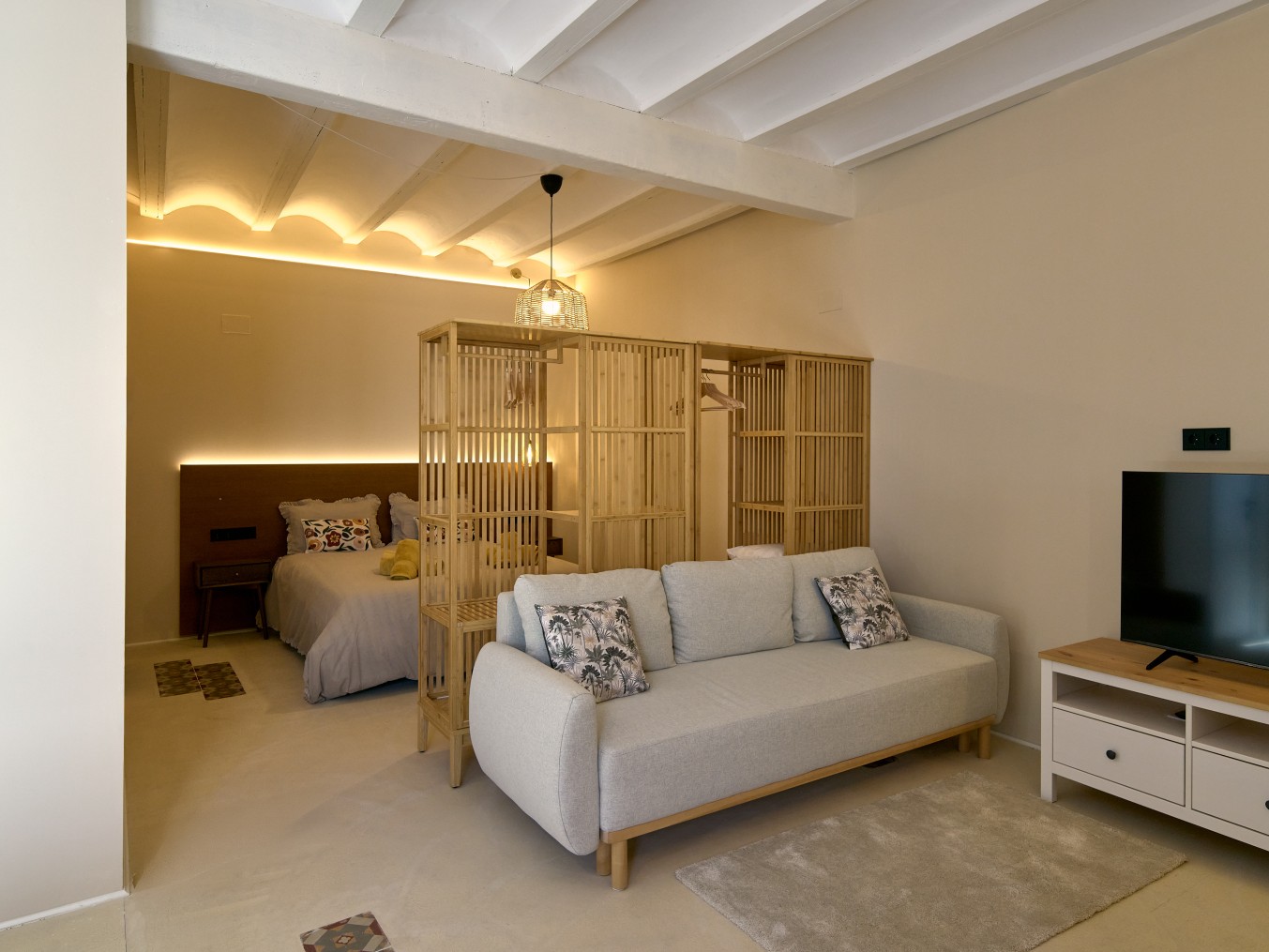Cuenta con zona de estar con sofá cama, cocina, dormitorio y baño, todo en un único, amplio y luminoso espacio.